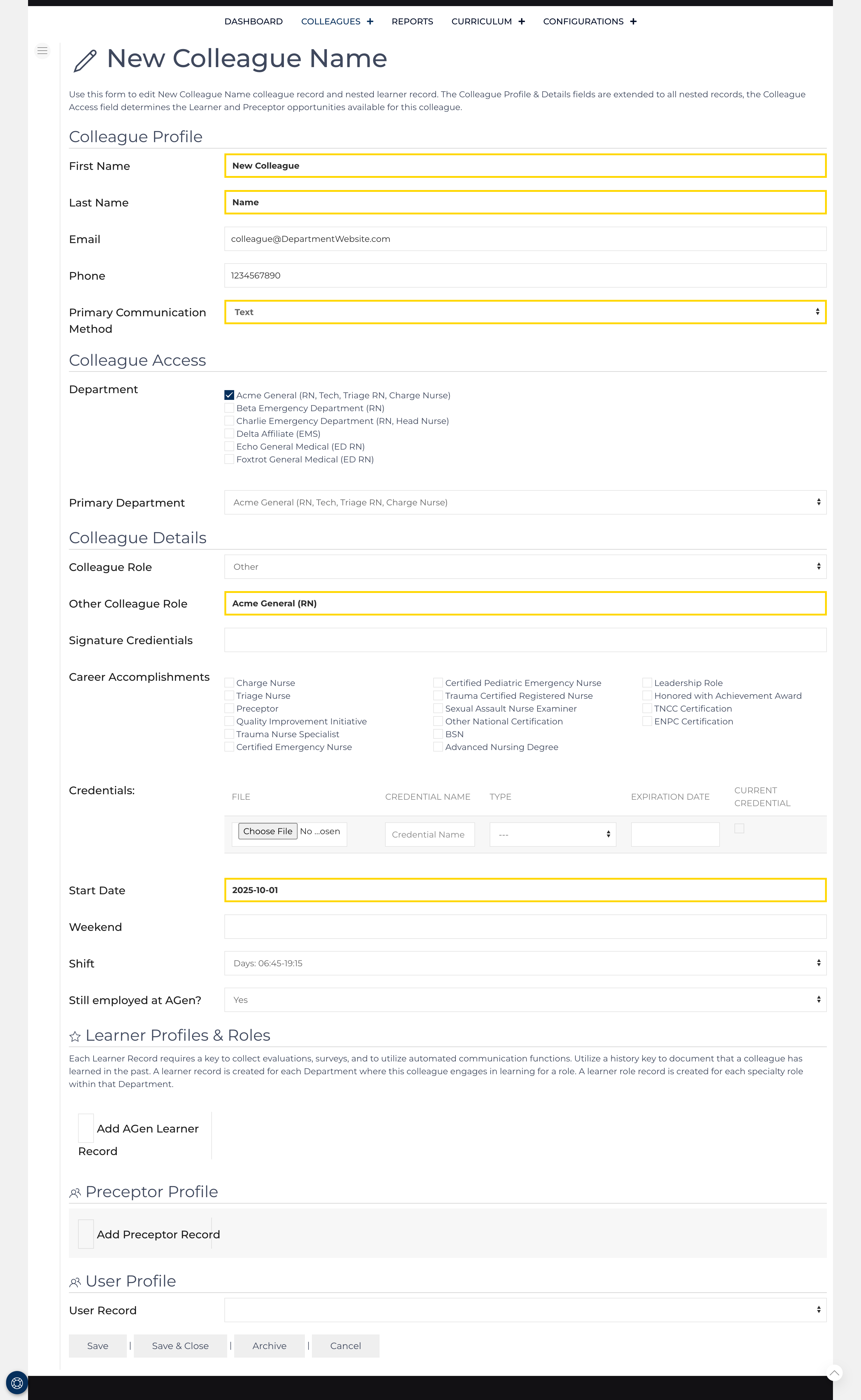 Colleague Profile, Access, and Detail fields are applied to any Learner, Preceptor, or User profile that is associated with this colleague record.