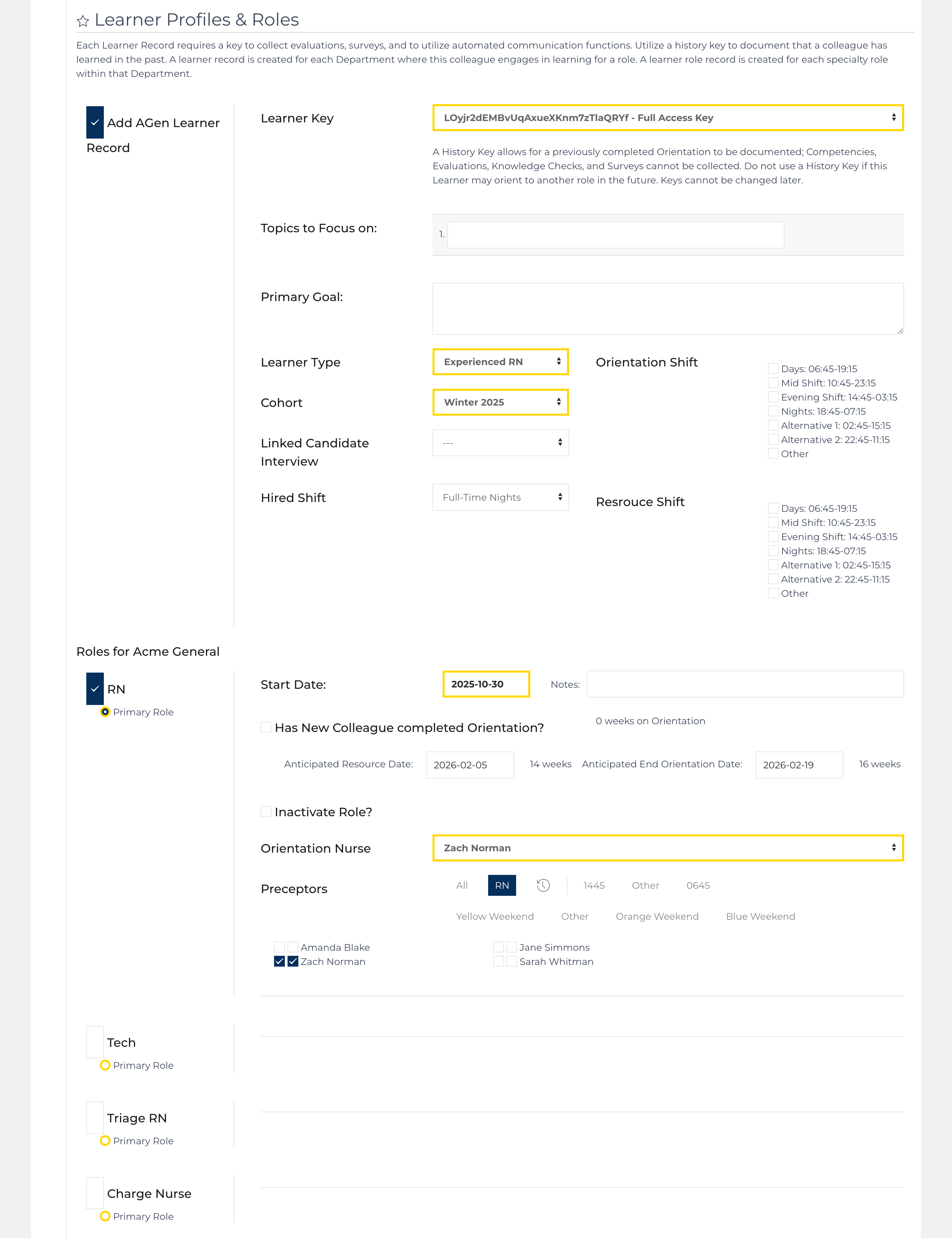 By default, today's date is used for the Start Date. This should be the first date the colleague worked within the organization. Each Learner Role record and the Preceptor record include start and end dates indicating when the colleague began each role.