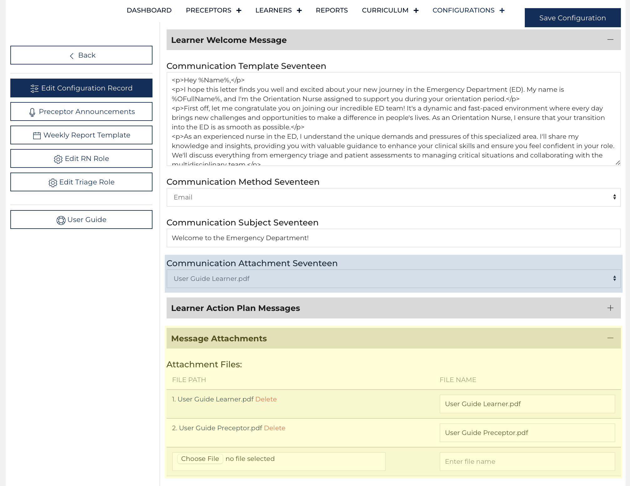 Message Ten (Preceptor Message) and Message Sixteen (Learner Welcome Message) can have attachments.