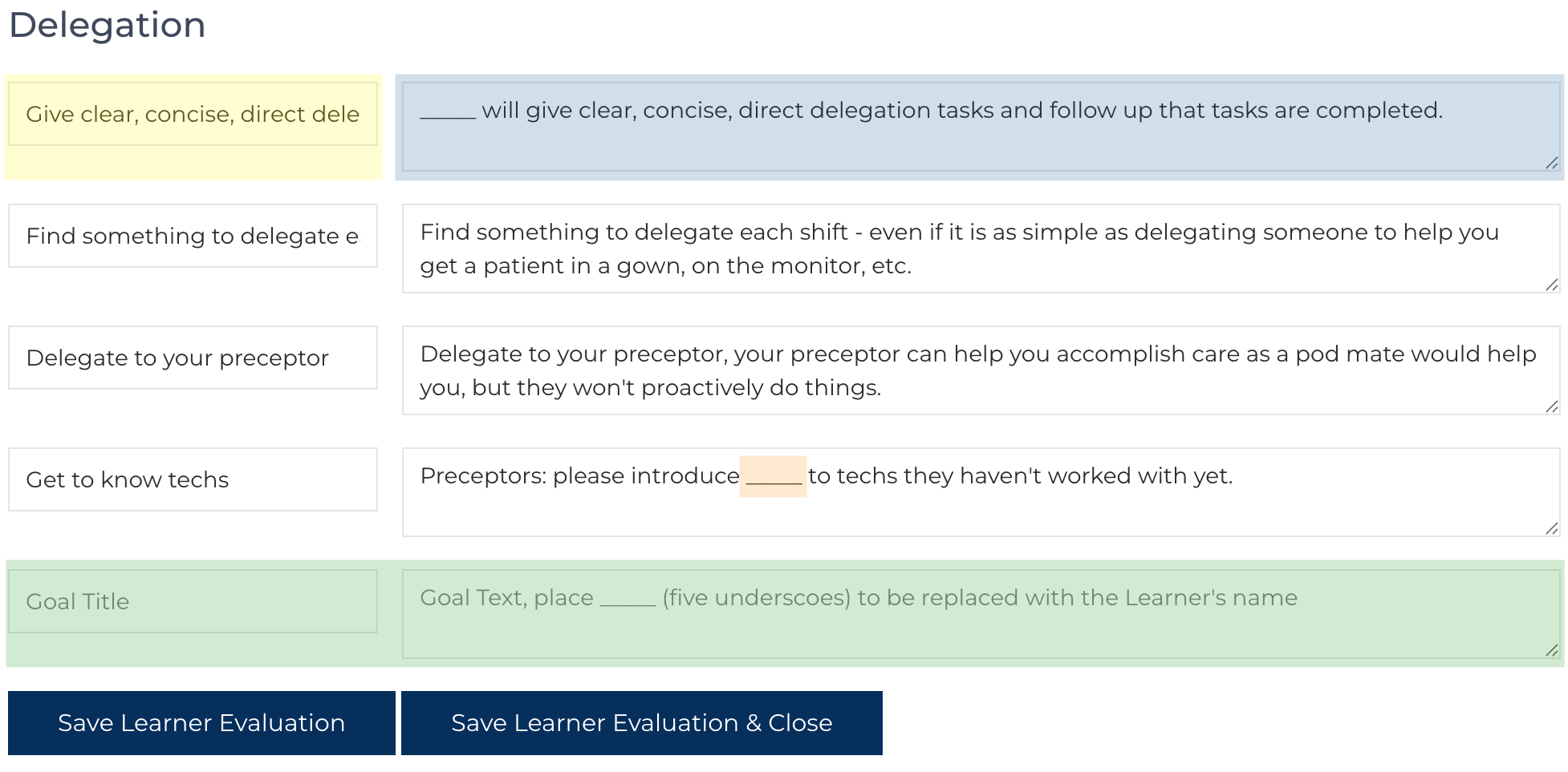 The Goal that will be displayed and entered on the Formal Evaluation is highlighted in blue. The use of five underscores (_____) will be substituted for the Learner's Name. The goal can be refined from the template before completing the Formal Evaluation by the Orientation Nurse User.