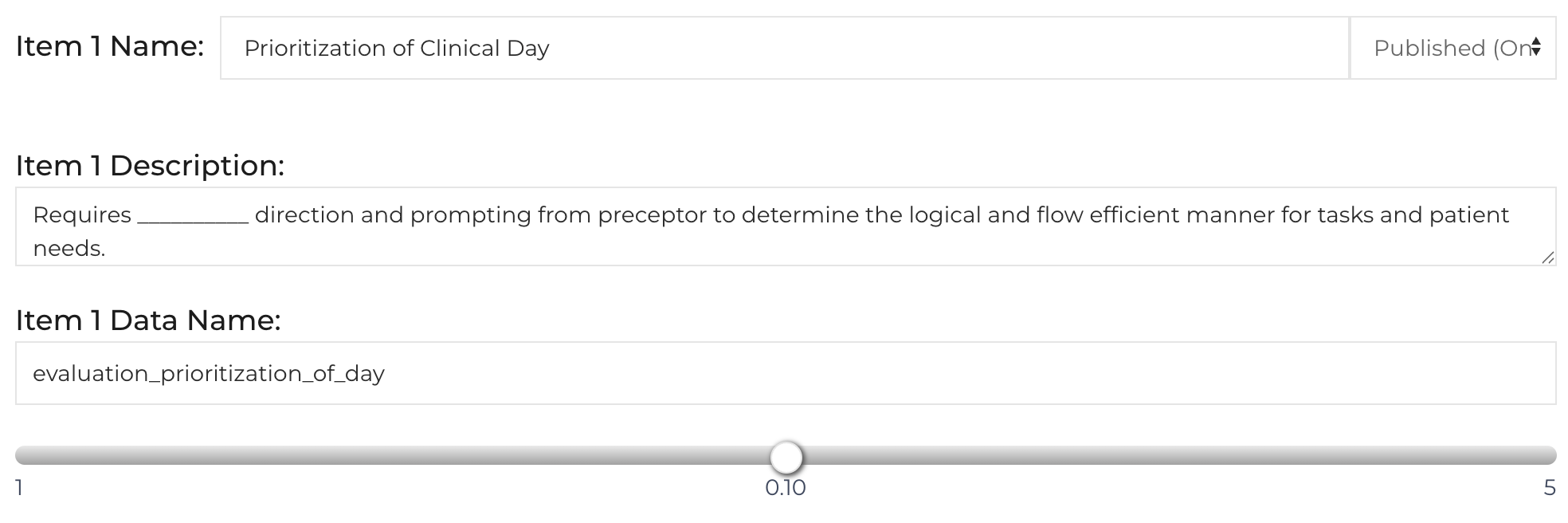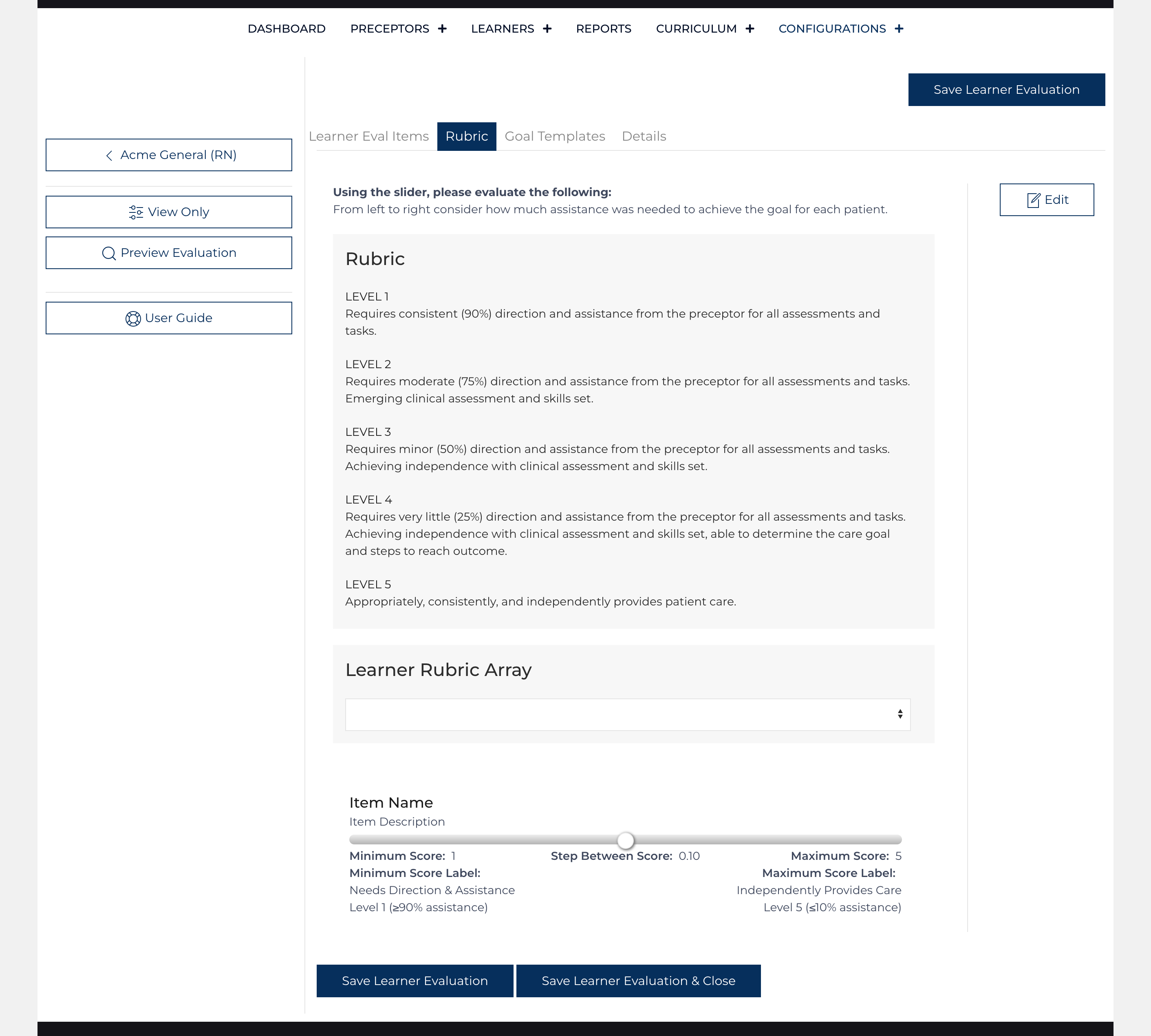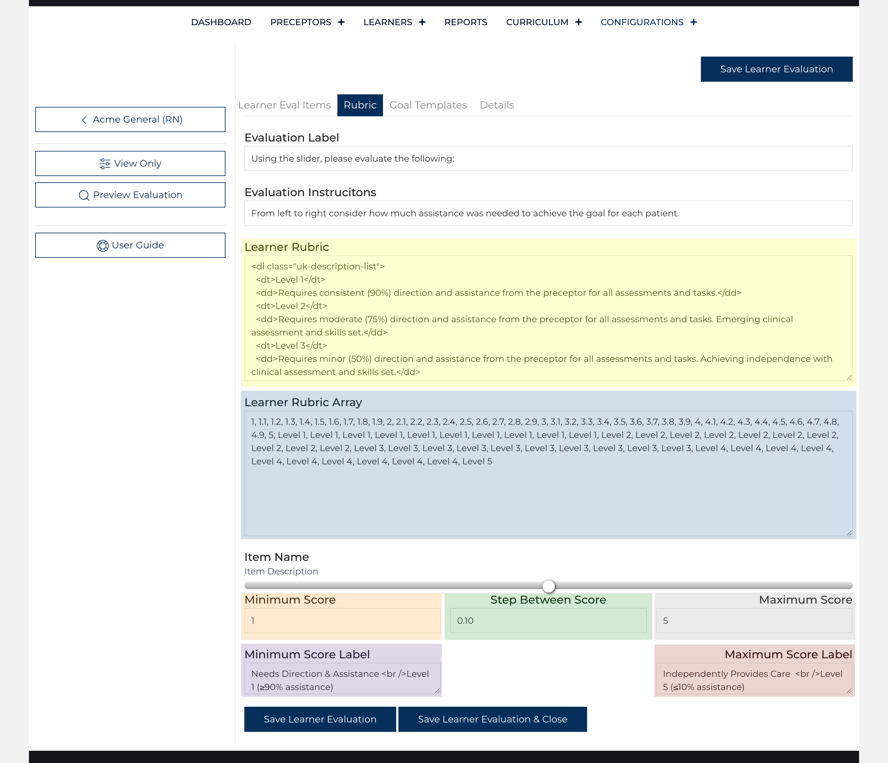 Each item on the Learner Evaluation can be customized. The Preceptor is asked to rate the learner on a series of items regarding their effectiveness in their new role. Customize each item: Item Name, Choose where to publish (Daily / Formal / Both), and Description. The Minimum Score, Maximum Score, and Steps on the scale are based on the rubric.
