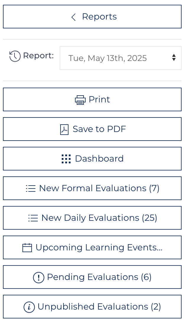 Listing of evaluations are summarized in the e-mail as bullet points but listed in the Full report as sortable and searchable data tables first for formal evaluations if there are any new items then for new daily evaluations.