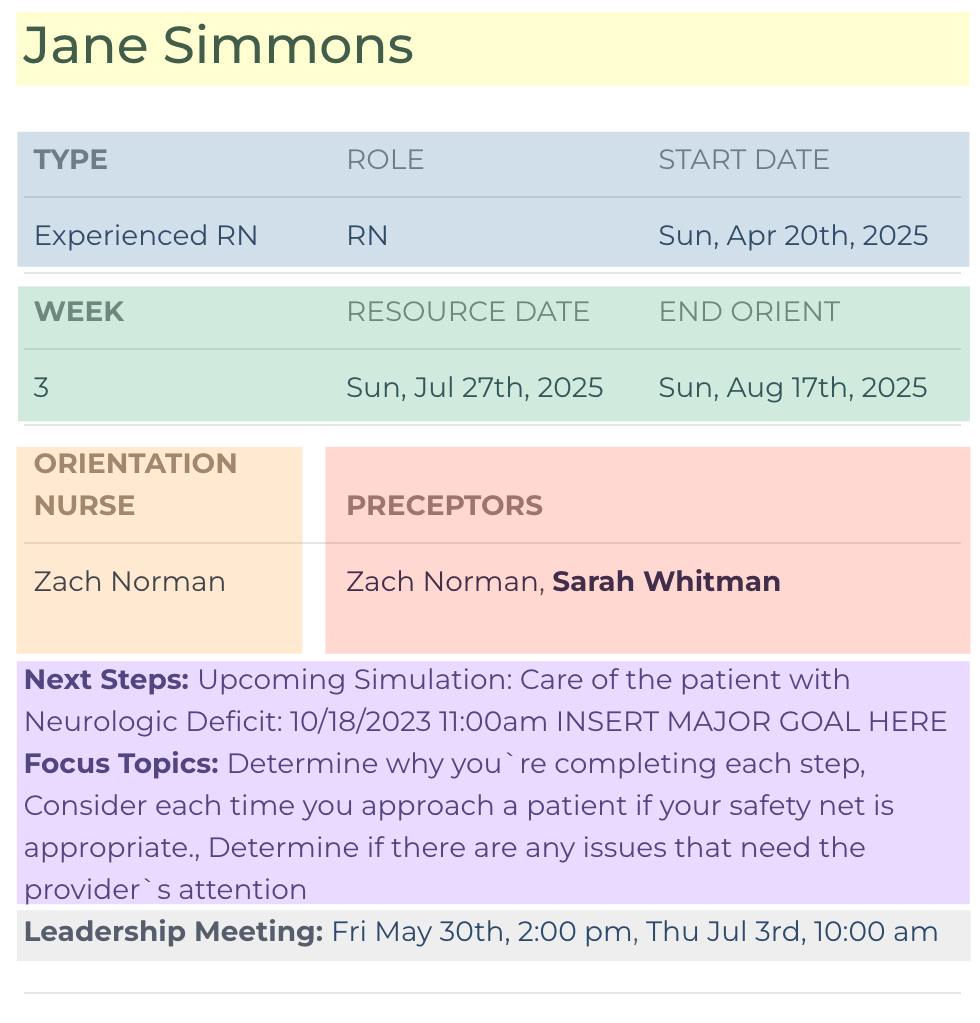 The message begins with personalized content that was prepared by an Orientation Nurse and then information is automatically compiled to offer a comprehensive review of orientation activities. Each section is displayed because there is content to report and because the template and Orientation Nurse who prepared the message selected to include the information.