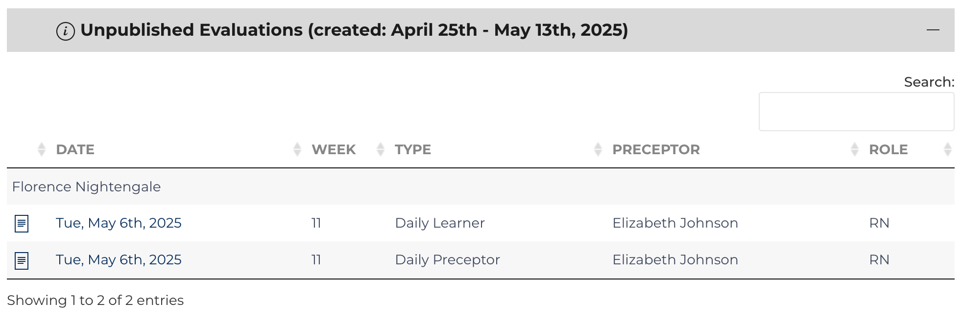 The pending evaluations list view is summarized in the e-mail version and displays a sortable, searchable list view. This section produces an alert if too many evaluations have not been submitted and are pending. The Unpublished evaluations section is displayed only to Orientation Nurses as they are the users who can choose to publish evaluations[2].